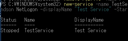 new-service -name TestService -binaryPathName "C:\WINDOWS\System32\svchost.exe -k netsvcs" -dependson NetLogon -displayName "Test Service" -StartupType Manual -Description "This is a test service."