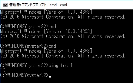 4、コマンドプロンプトから、cmdでさらに2つのコマンドプロンプトを起動する。最後に起動したコマンドプロンプトは、コマンドの記憶ができない。 F7キー(コマンド履歴)を押すと履歴の表示はされない。さらに、カーソルキーの上を押しても履歴の表示はできない。