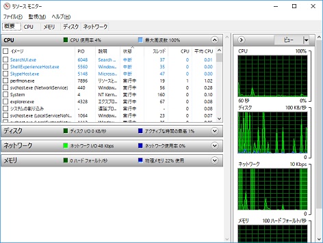 Windows10のリソースモニターで、プロセスが使用しているネットワーク状況の確認をする方法