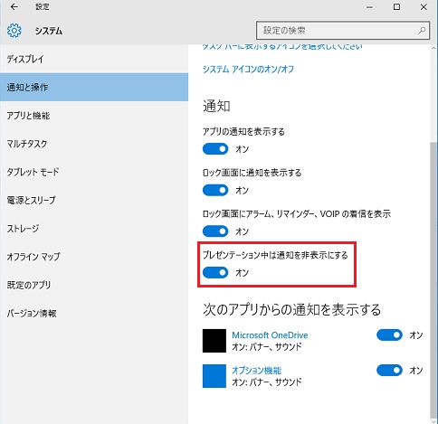 3、通知と操作内の、プレゼンテーション中は通知を非表示にするをオンにすると、プレゼンテーション中は表示されない。
