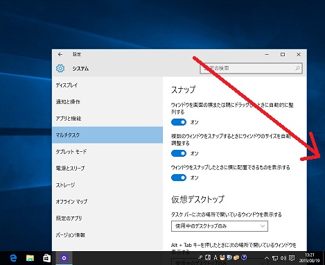 3、マルチタスク内の、スナップ設定で可能。ウィンドウを画面の横または隅にドラッグしたときに自動的整列するで設定する。