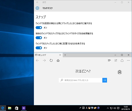 ※スナップ(スナップビュー)とは、ウィンドウを画面の端まで持っていくと自動整列する機能のことである。一番下に例アリ。
