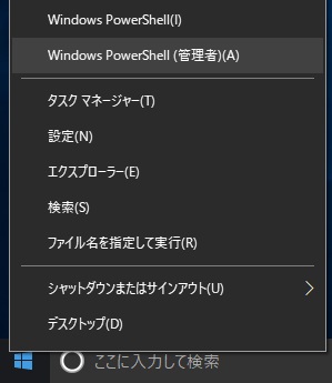 1、スタートを右クリック⇒Windows PowerShell(管理者)を選択。尚、管理者でなくても問題なし。