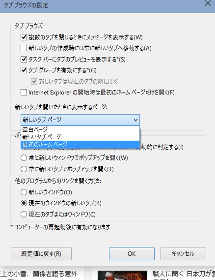 Windows10でIE11の新規タブ表示時にホームページを表示させる設定