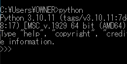 4、インストール後確認として、コマンドプロンプトでpythonと入力し以下のような画面になればOK。